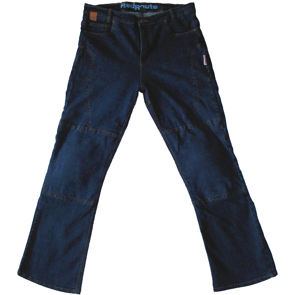 Wanting jeans rather than waterproof leather or textile trousers my missus opted for these Red Route boot cut Kevlar dragging jeans which offer up more protection in an incident than normal run of the mill jeans. They come complete with CE approved knee protectors which can be removed from the special knee pockets if desired, (not that you would want to). Obviously these jeans are not waterproof so not much use in a downpour but on nice days the provide more freedom than waterproof outfits. Features: