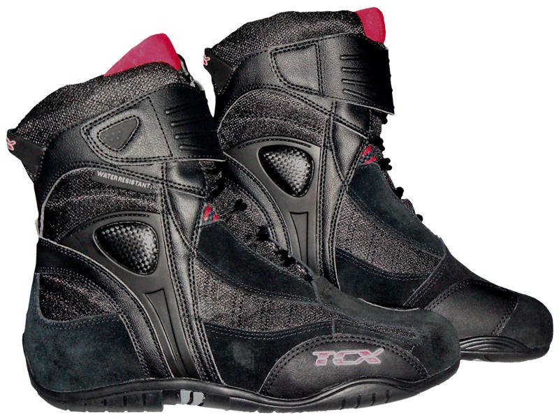 Not wanting a full length motorcycle boot my missus decided to go for the more "shoe" looking TCX X-Cube water resistant boots thinking it looked better with her dragging jeans. Not being a style guru and knowing the right time to argue the odds about protection I had to bite my lip. That said they obviously have been designed with motorcycle safety in mind so are more useful than a pair of trainers! Once again I have never heard of the make before but on investigation they have been around for a while and do seem to be rather popular. Features: