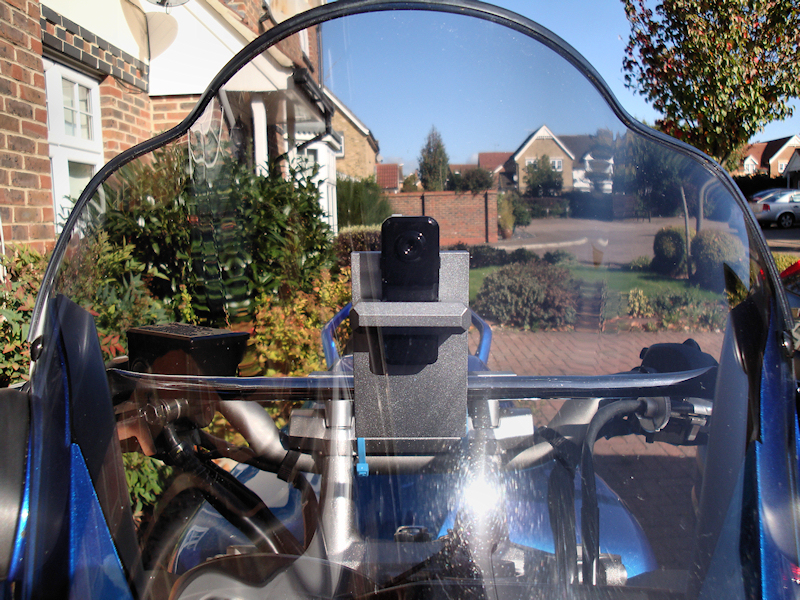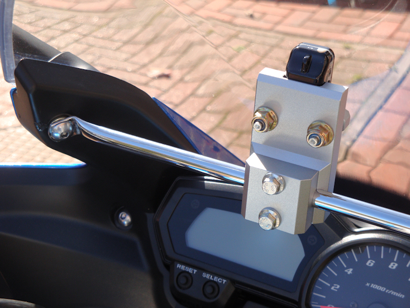 The Next Idea:Having found a small video camera that worked on my bike to an acceptable level, (the MD80 Mini DV camera) it was now a case of finding somewhere more suitable to mount the thing but in a place where it would not be influenced to much by vibration and the operation of the bike. So far my experimental "Mark 1" bracket proved that video capture was possible but the quality had been influenced by the steering motion of the bike and the issue of trying to focus through a "double bubble" screen resulting in somewhat wobbly footage.The New Placement:Having tried mounting on the handlebar clamp and then focusing through the screen I opted to try and move the camera forward and mount it rigidly in a fixed point behind the screen rather than having it move with the steering. This required making some sort of fixing bar to bridge across behind the screen hopefully using existing screws to fix it in place.The Crossbar:I found an old piece of chrome plated 10mm diameter tube, (figure 1) in my shed, (forget where it was originally from). flattened and bent the ends to roughly the angle required for the fixing point on to the bike, (Figure 2). then drilled and filed two 5mm slots about 8mm long, (figure 3). This was to allow for any discrepancy in measurement. Offering it up to the bike for inspection I was satisfied that the slots and angle of bend were good enough and fixed it to the bike using existing screws, (figures 4, 5 & 6).The Pivot Bracket:My design for the bracket and clamp are somewhat over engineered simply because I have access to the machinery and materials to be able to do the job. The main important dimension is for the slot that the camera sits in, the rest is open to adjustment.