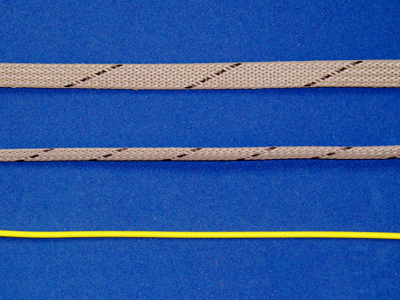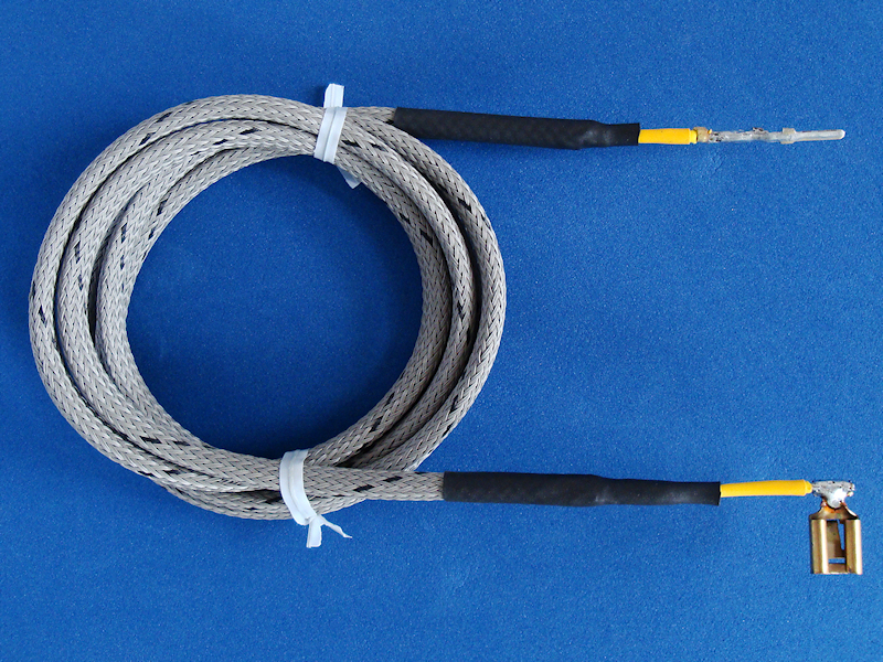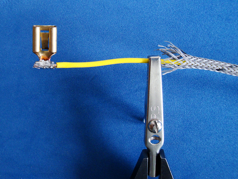 The Method:First, tin the two end connectors with leaded solder, this will make soldering the wire on easier at a later date, (Figures 1 & 2).Cut the wire to a length of 1.22 Meters Bare, twist and tin the end of the wire for 12mm then solder the wire to the terminal block connector, (figure 3). When the solder has cooled crimp the tabs around the wire with pliers. Cut two pieces of the yellow heat shrink tube to a length of approximately 50mm, slide these over a 1.17 meter length of the smaller sized 5mm diameter bore Flexo outer sleeving, pass the wire through the sleeving then apply heat to the heat shrink tube at the end you have just soldered the terminal to, this neatens the end and stops the Flexo sleeving from fraying. Bare, twist and tin the other end of the wire for 12mm then solder the wire to the spade connector ensuring the 90° approach is from the correct side, (figure 4) as it will only fit in to the bulb connector block one way round. Stretch the flexo cable to within 25mm of the other end and slide down the other piece of heat shrink tube until it meets the terminal joint. Apply heat to shrink the heat shrink tube, this neatens the other end and stops the Flexo sleeving from fraying. Cut two pieces of the black heat shrink tube to a length of approximately 60mm, slide these over a 1.17 meter length of the larger sized 8mm diameter bore Flexo outer sleeving, (you will need to experiment with the amount of stretch before cutting to length). Pass the newly created wire loom, (small terminal end first) through the larger bore Flexo Sleeving. Slide the two larger pieces of heat shrink tubing to each end and apply heat. This neatens the ends, stops the Flexo sleeving from fraying and adds a double thickness protection to the loom wire. The loom wire is now complete and ready for fitting to the bike, (figure 5). |