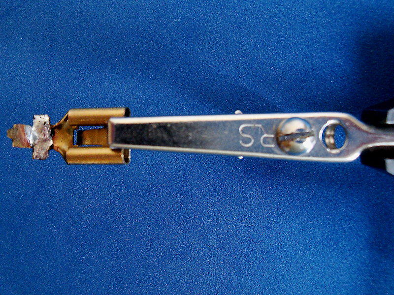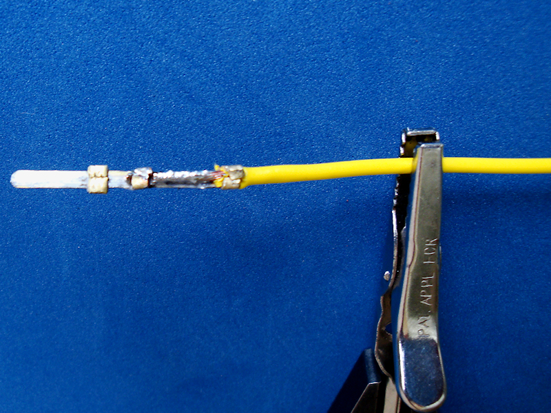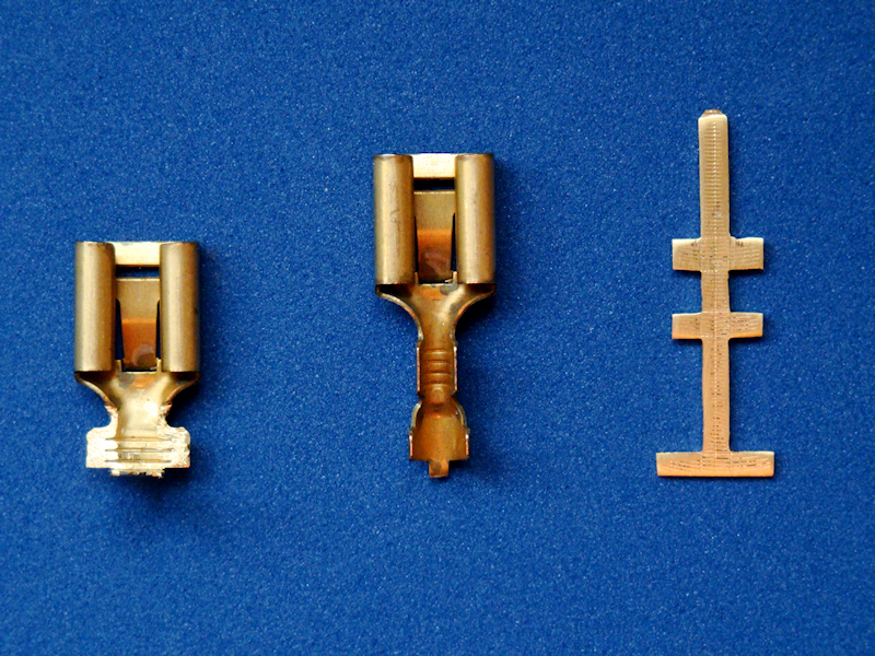 The Replacement Wire:Before starting the dual headlight modification a replacement wire for the loom needs to be made to go in place of the one that has been removed by the manufacturer. There have been numerous different write ups on how to make this replacement wire, this is a sort of compilation using ideas from some of them and some ideas of my own showing what I have done.There seems to be some difficulty getting the correct 8.1mm spade connector for the block connector at the bulb end of the wire in this country, (UK) so a standard straight shank spade connector is modified to allow a 90° approach. The terminal for the block connector is manufactured out of some 0.65 thick brass, (see diagram at the foot of the page). The loom wire is 32 strand by 0.2mm wire 1.22 Meters long with an ampere rating of just over 8 amps, (minimum required must be at least 4.6 amps for a 55 Watt bulb), (55 Watts divided by 12 volts equals 4.6 amps). The Components:You will need these following items to make the replacement loom along with some other basic tools such as a soldering iron, a pair of wire cutters, wire strippers and a pair of pliers.