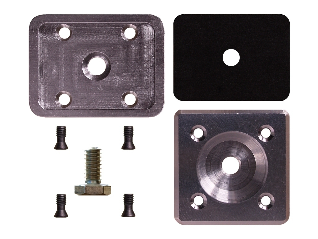 This is a piece of aluminium plate 4mm thick with a machined recess 0.5mm deep, (the same profile as the foam pad) and a series of matching countersunk screw holes for fixing it to the threaded holes in the base plate.