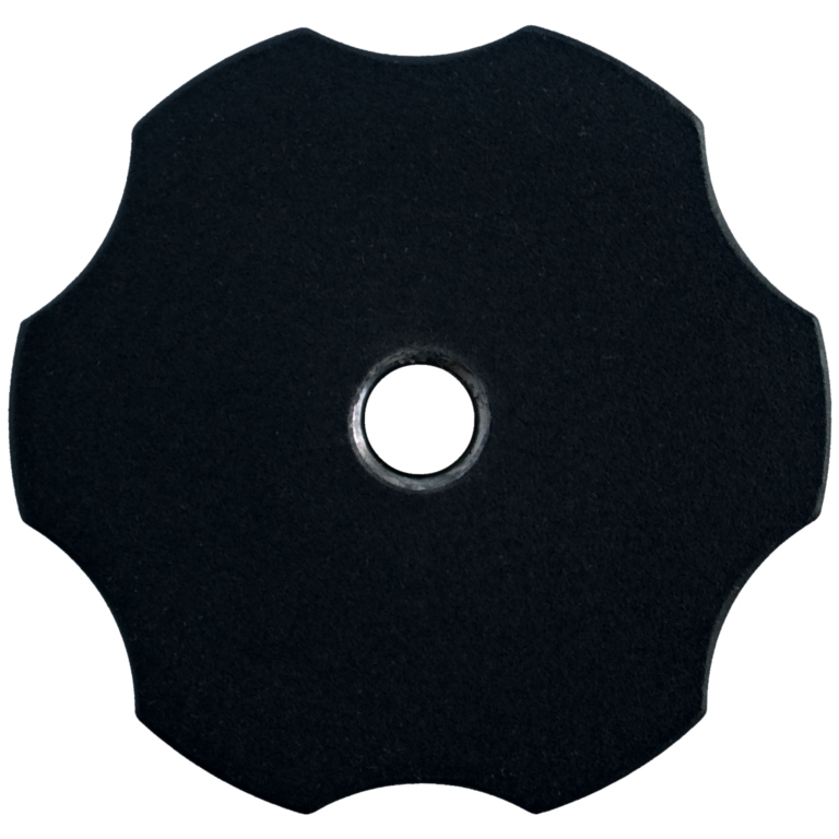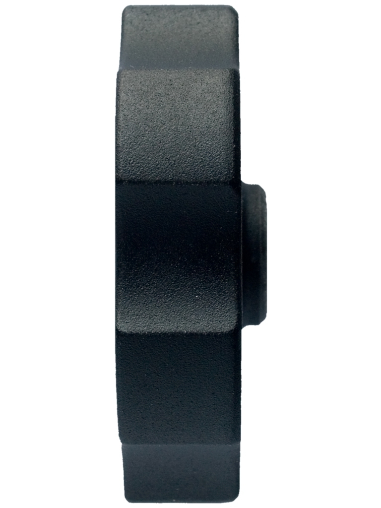 Larger side view of the homemade thumb wheel, sprayed in satin black paint for finish.
