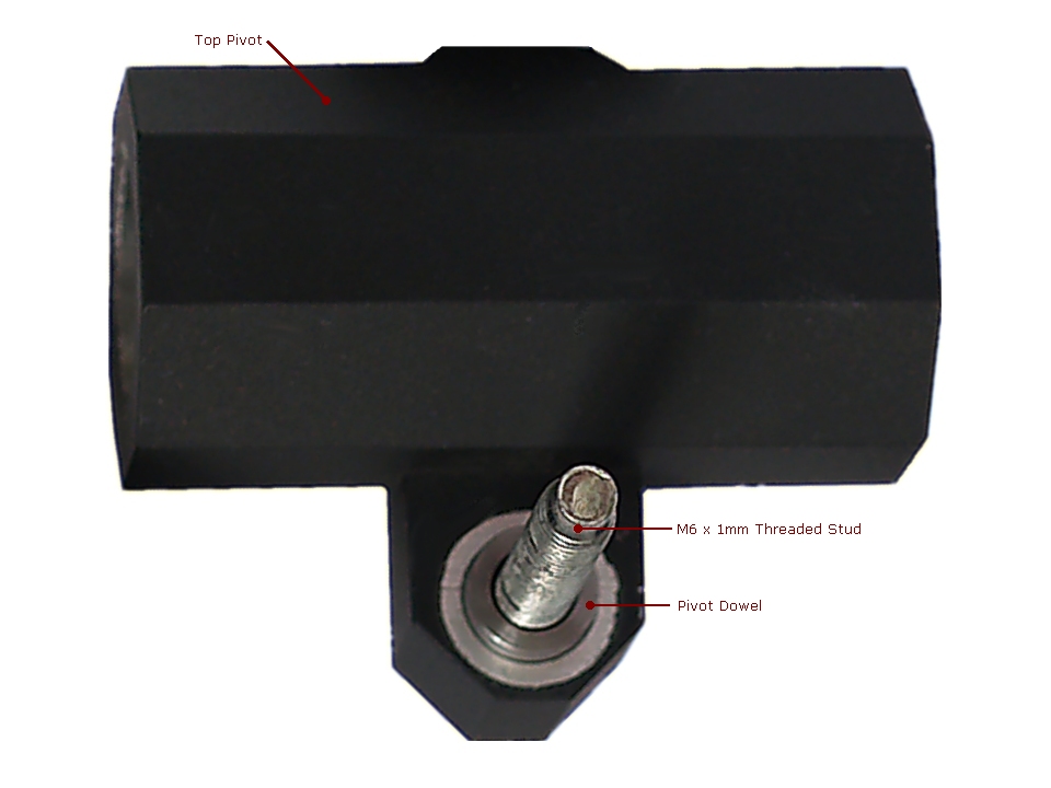 Larger view of the top pivot showing assembled M6 x 1.0mm threaded stud and pivot dowel.