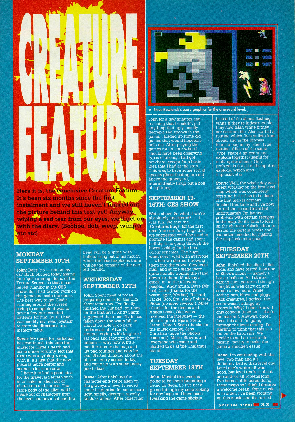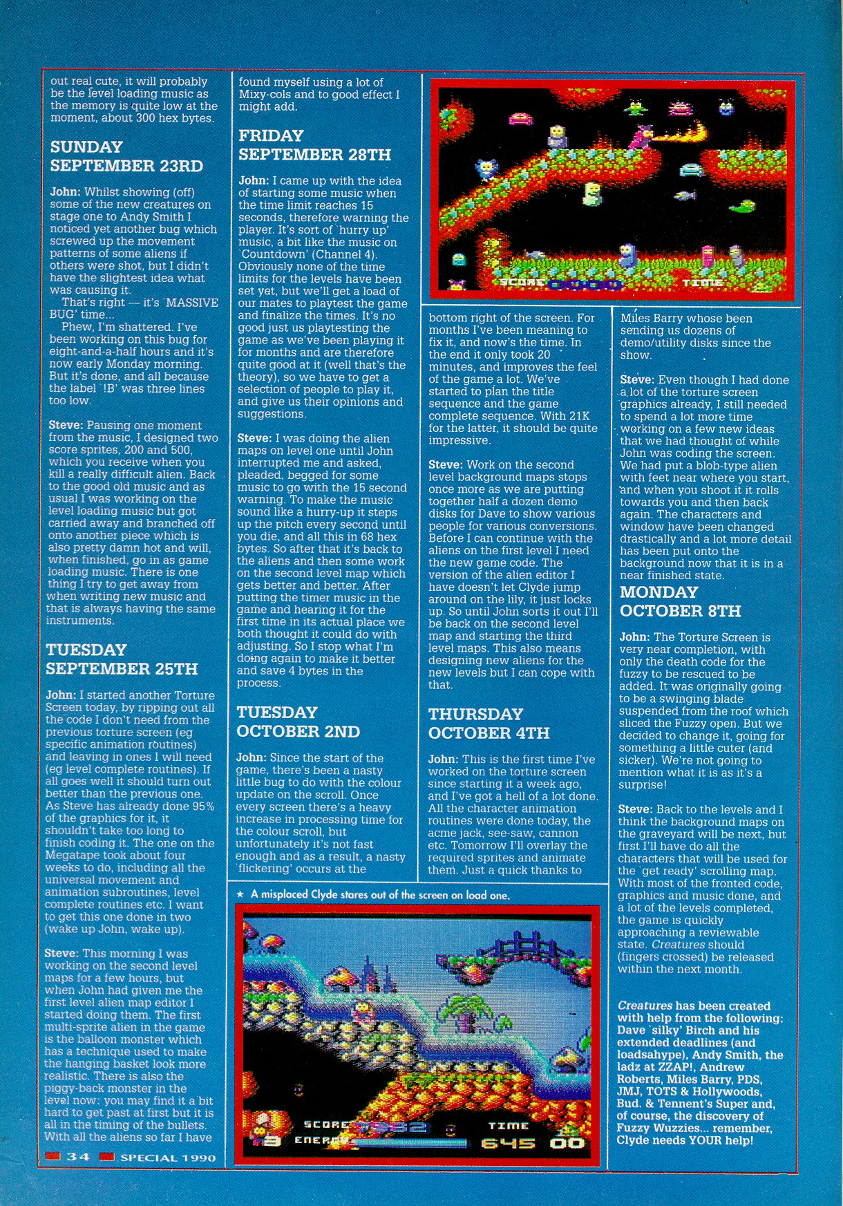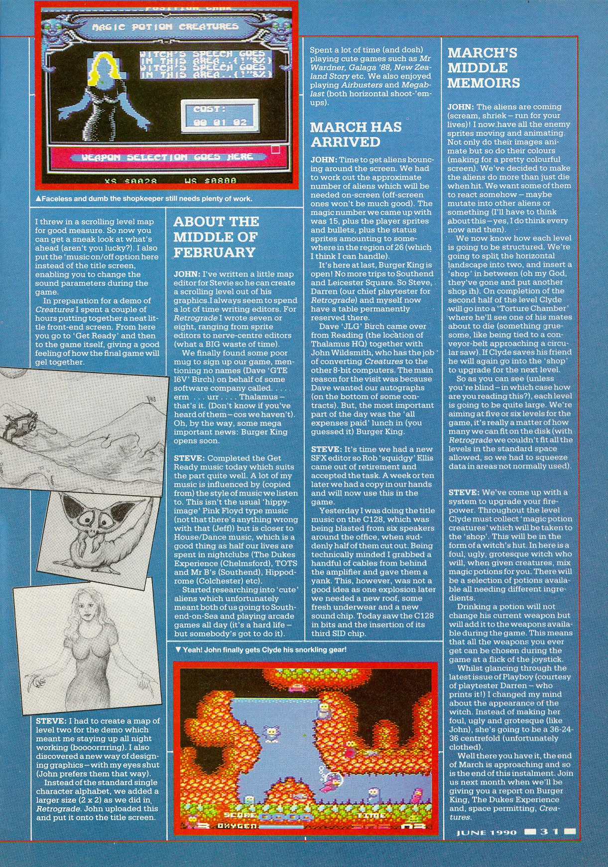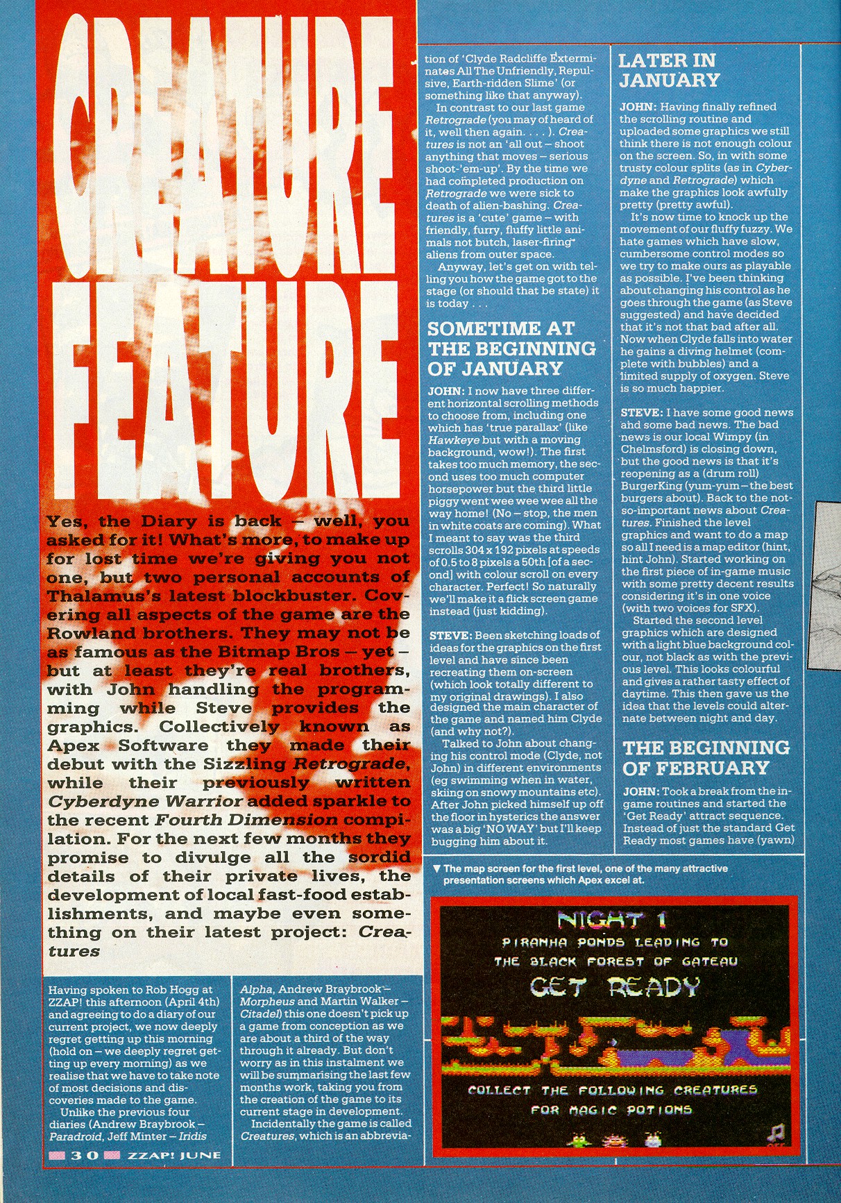 Creatures has been created with the help from the following: Dave 'silky' Birch and his extended deadlines (and loadsahype), Andy Smith, the ladz at ZZAP!, Andrew Roberts, Miles Barry, PDS, JMJ, TOTS & Hollywoods, Bud. & Tennent's Super and, of course, the discovery of Fuzzy Wuzzies... remember, Clyde needs YOUR help!