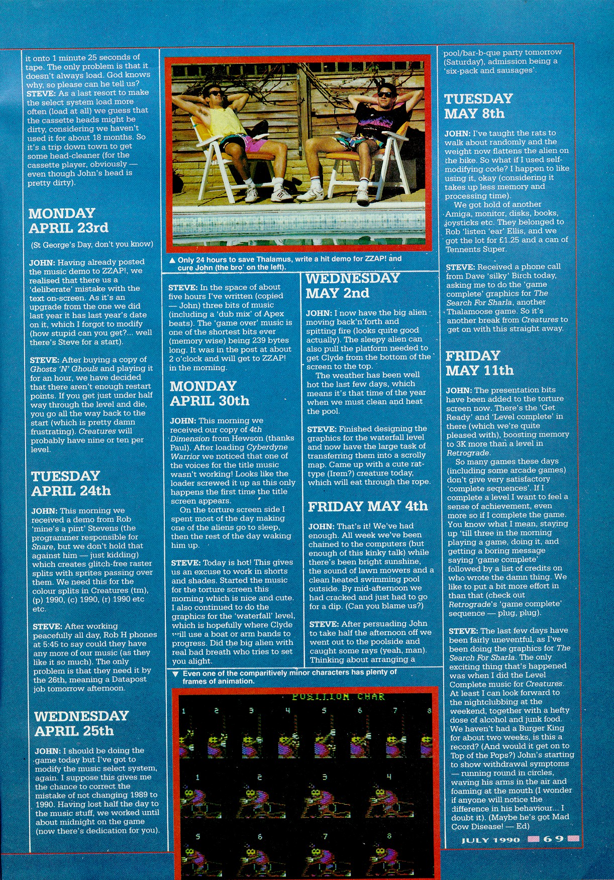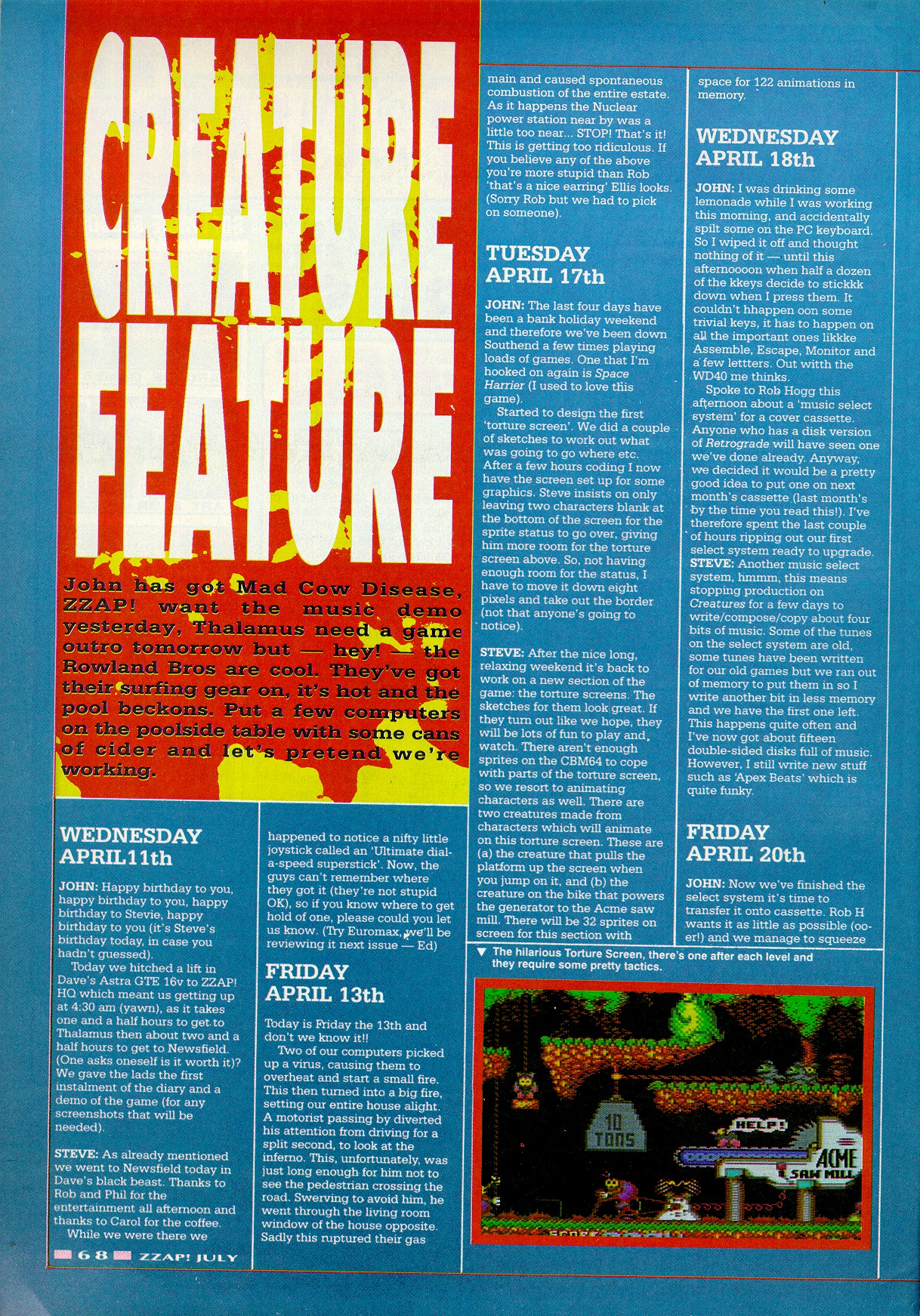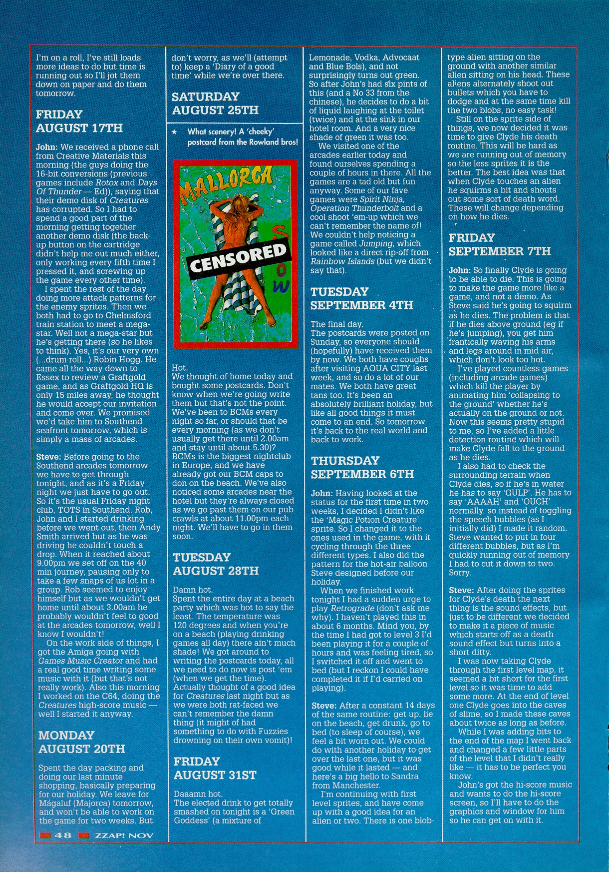 Here it is - the penultimate instalment (I know we said this last month but this time we mean it), and with the standard Diary of a game'' we also bring you a Diary of a good time''. Yes this month we were forced to take a break from Creatures and go on holiday for two weeks. Oh well.