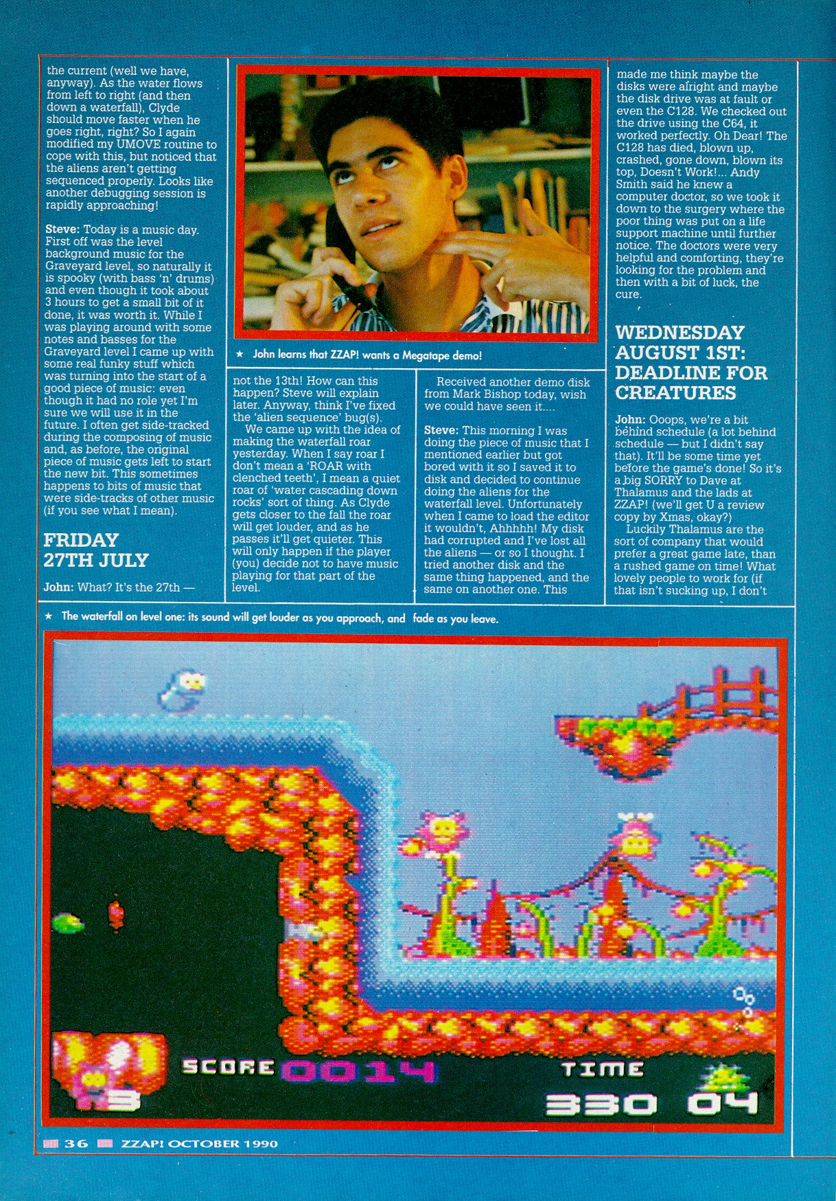 JOHN: We received a phone call from Creative Materials this morning (the guys doing the 16-bit conversions) (Previous games include Rotox and Days of Thunder - Ed)), saying that their demo disk of Creatures has corrupted. So I had to spend a good part of the morning getting together another demon disk (the back-up button on the cartridge didn't help me out much either, only working every fifth time I pressed it, and screwing up the game every other time).